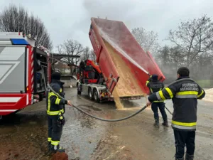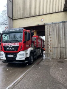 Seit 10:43 Uhr unterstützt unser Wechselladerfahrzeug (WLF) beim Großbrand in Grieskirchen. Mit dem Abrollbehälter Mulde wird Material aus einer Siloanlage abtransportiert.