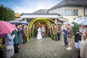 Trotz Regen konnte das traditionelle Schlauch-Spalier stattfinden – wenn auch etwas kürzer. Für die Agape wurden kurzerhand zwei Zelte aufgestellt, sodass die Stimmung bestens blieb.