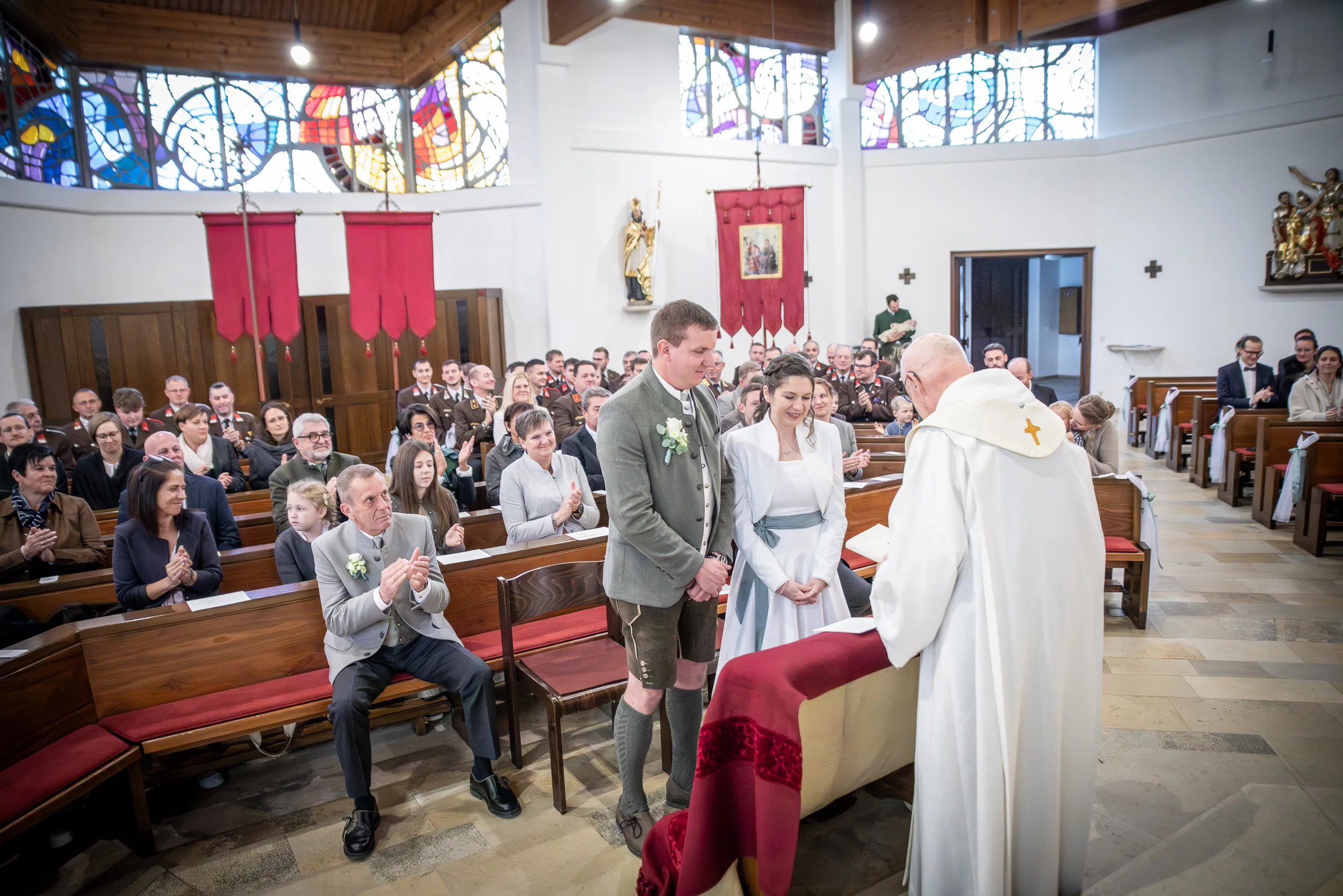 Um 13:00 Uhr gaben sich Julia und Richard in der katholischen Pfarrkirche das Ja-Wort und luden die gesamte Feuerwehr ein, diesen Tag mitzufeiern.